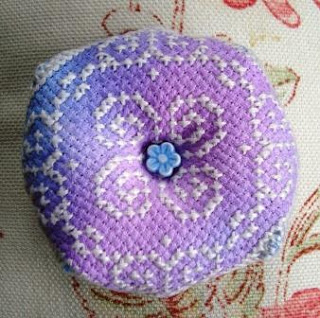Geborduurd op Miek's geverfde stof met DMC Blanc en daarna er een kleine biscornus van gemaakt.